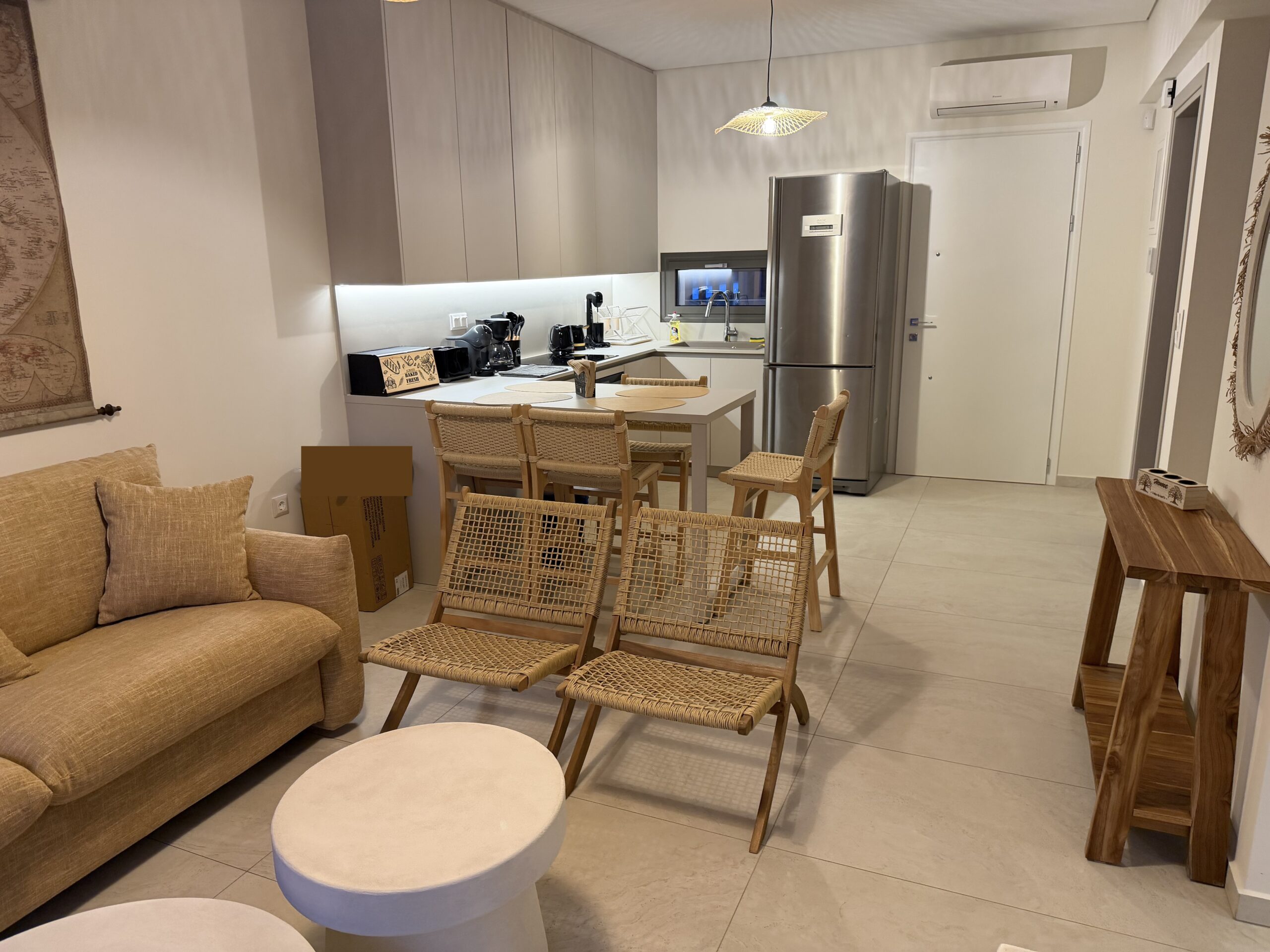 An open-plan living and dining area with direct access to the terrace, designed to offer comfort, functionality and a relaxed stay in Nikiti. The bright layout creates a welcoming atmosphere for slow-paced holidays.
